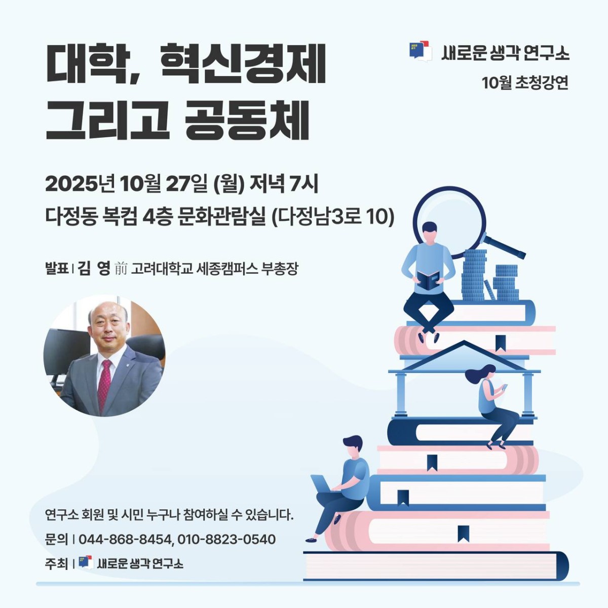 새로운 생각 연구소(이하 ‘새로운 생각’)는 10월 27일(월) 저녁7시에 세종시 다정동 복합커뮤니티센터 4층 문화관람실에서 10월 초청 강연회를 개최했다. 강연 주제는 “대학, 혁신경제 그리고 공동체”로 김영 전 고려대학교 세종캠퍼스 부총장의 강연과 질의응답으로 이어졌다.