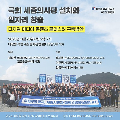 26일 새로운생각연구소에 따르면 최근 다정동 복합커뮤니티센터 문화관람실에서 연 '국회세종의사당 설치와 일자리 창출: 세종 디지털 미디어·콘텐츠 클러스터 구축방안' 토론회에선 미디어…