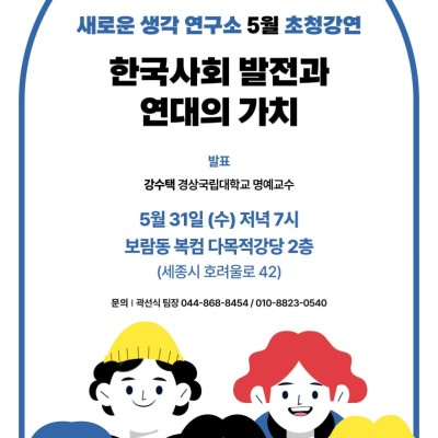 '새로운 생각 연구소', 31일 초청 강연강수택 경상국립대 명예교수:"연대의 다른 표현인'공감과 박애'로사회발전가능...인성교육 강화도 중요"(5월 강연의 자세한 내용은 기사의 링…