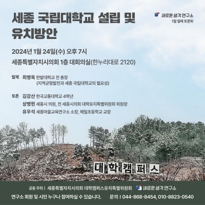 세종시의회 ‘대학캠퍼스 유치를 위한 특별위원회’(이하 ‘대학캠퍼스유치특위’)는 ‘새로운생각연구소’와 함께 24일 세종 국립대학교 설립 및 유치방안을 위한 전략적 방안을 모색했다.출…