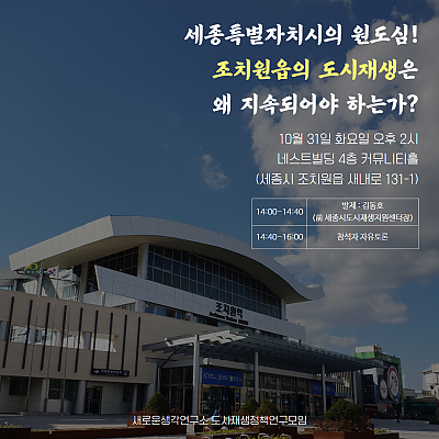 새로운생각연구소(연구소장. 조상호)가 연구소 출범 후 첫 번째 모임으로 10월 31일 오후 2시에 조치원 네스트빌딩 4층에서 조치원읍의 도시재생은 왜 지속되어야 하는가?의 주제로 …