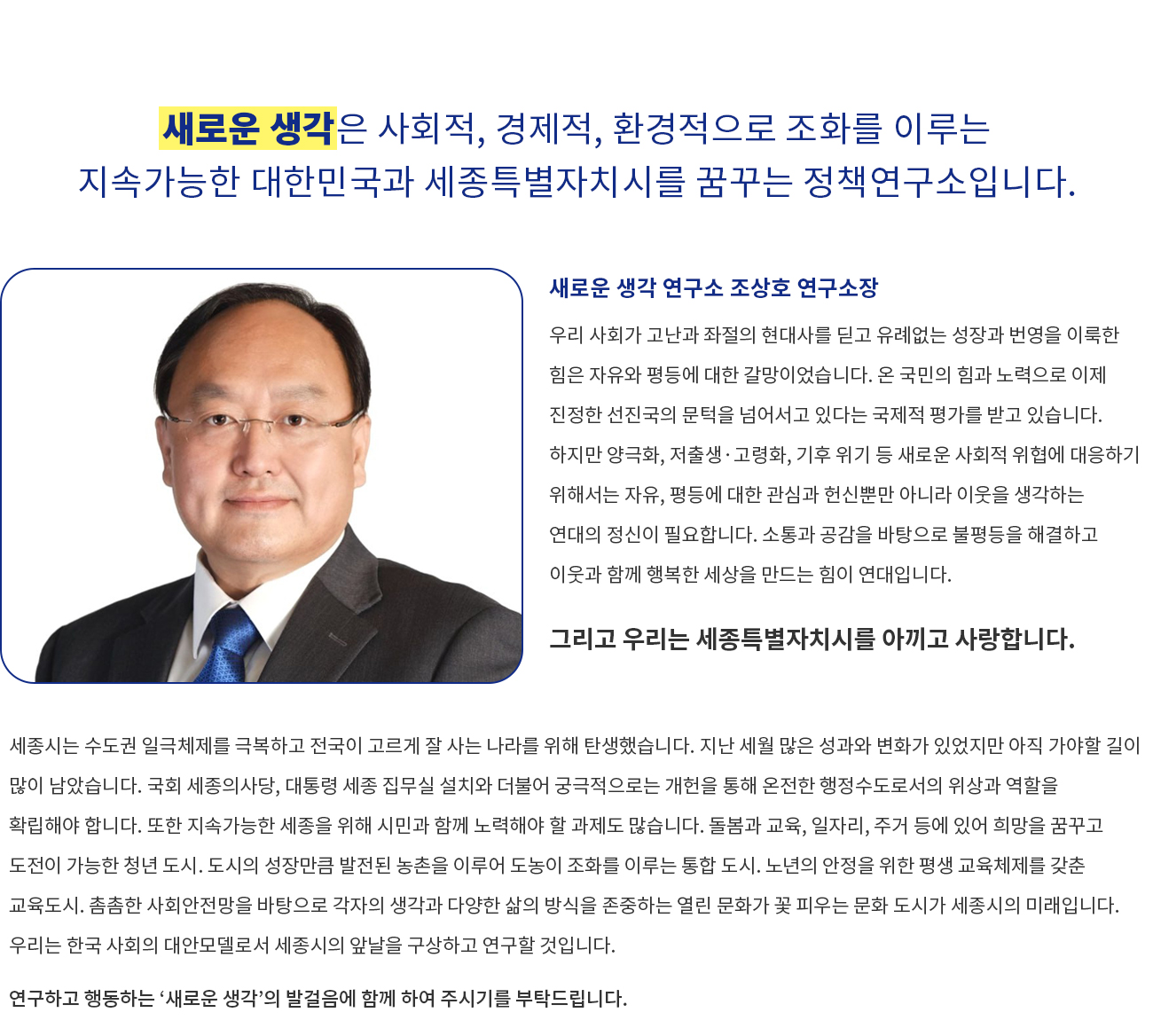 세종시는 수도권 일극체제를 극복하고 전국이 고르게 잘 사는 나라를 위해 탄생했습니다. 지난 세월 많은 성과와 변화가 있었지만 아직 가야할 길이 많이 남았습니다. 국회 세종의사당, 대통령 세종 집무실 설치와 더불어 궁극적으로는 개헌을 통해 온전한 행정수도로서의 위상과 역할을 확립해야 합니다. 또한 지속가능한 세종을 위해 시민과 함께 노력해야 할 과제도 많습니다. 돌봄과 교육, 일자리, 주거 등에 있어 희망을 꿈꾸고 도전이 가능한 청년 도시. 도시의 성장만큼 발전된 농촌을 이루어 도농이 조화를 이루는 통합 도시. 노년의 안정을 위한 평생 교육체제를 갖춘 교육도시. 촘촘한 사회안전망을 바탕으로 각자의 생각과 다양한 삶의 방식을 존중하는 열린 문화가 꽃 피우는 문화 도시가 세종시의 미래입니다. 우리는 한국 사회의 대안모델로서 세종시의 앞날을 구상하고 연구할 것입니다. 연구하고 행동하는 ‘새로운 생각’의 발걸음에 함께 하여 주시기를 부탁드립니다.