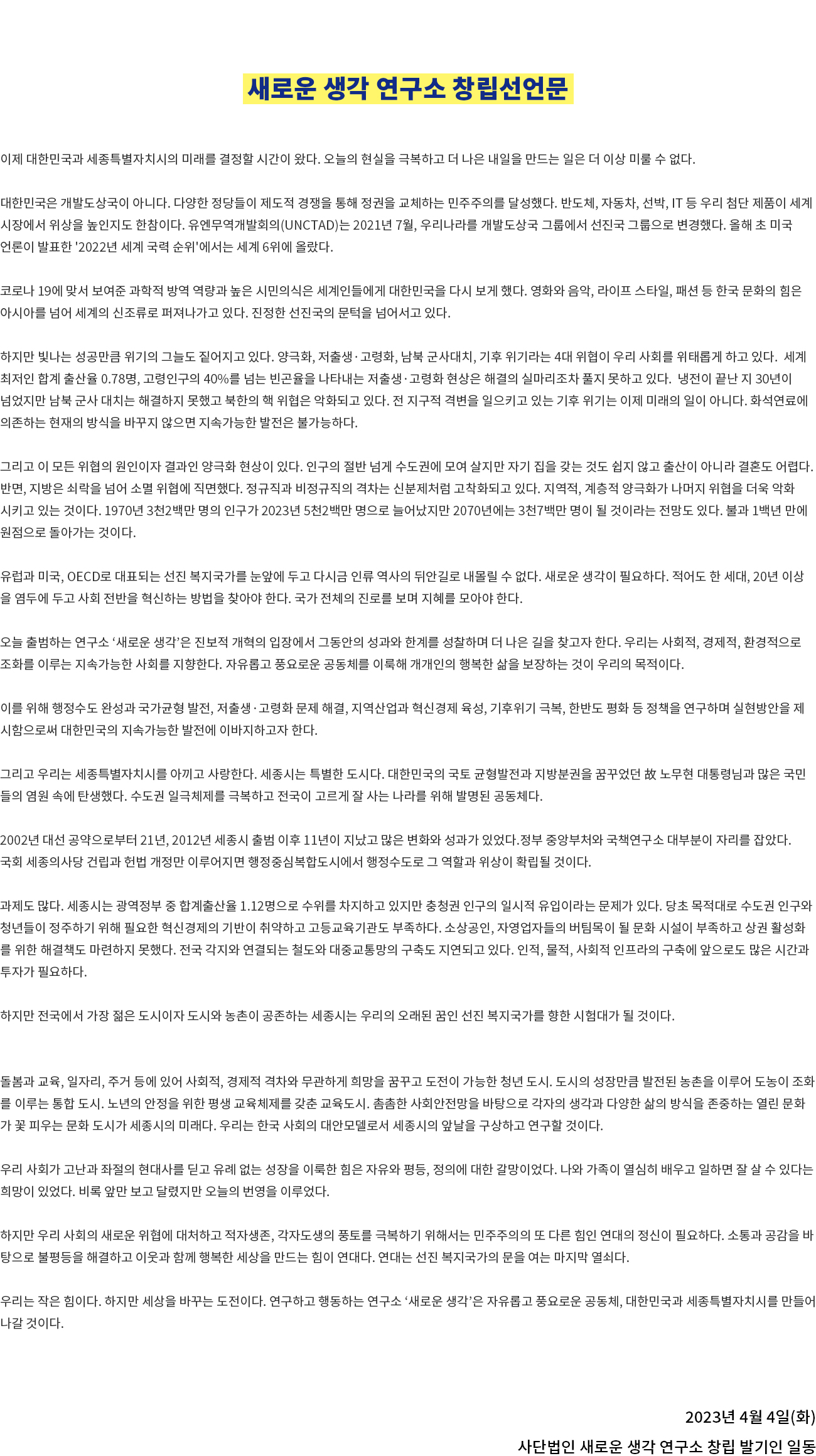 우리는 작은 힘이다. 하지만 세상을 바꾸는 도전이다. 연구하고 행동하는 연구소 ‘새로운 생각’은 자유롭고 풍요로운 공동체, 대한민국과 세종특별자치시를